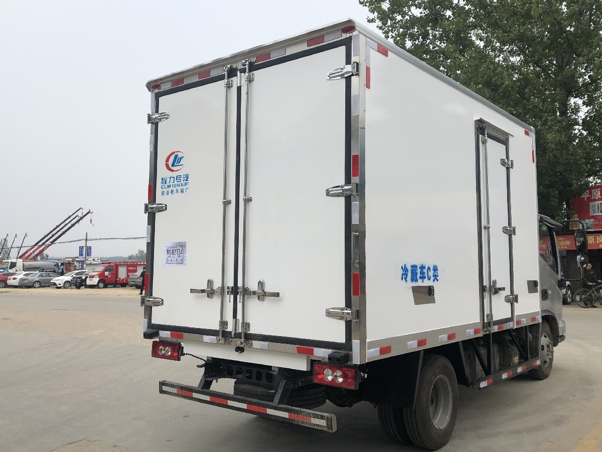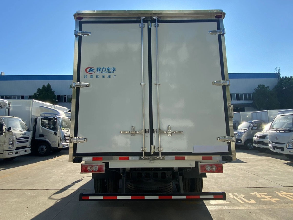(2)廂板材質:內外壁板選用國內優質玻璃鋼(不吸光、隔熱性好、硬度強、抗氧化);中間保溫層為XPS擠塑聚笨板或聚氨酯;廂體厚度8CM。地板采用鋁花紋板,門邊條采用迷宮式橡膠密封條。