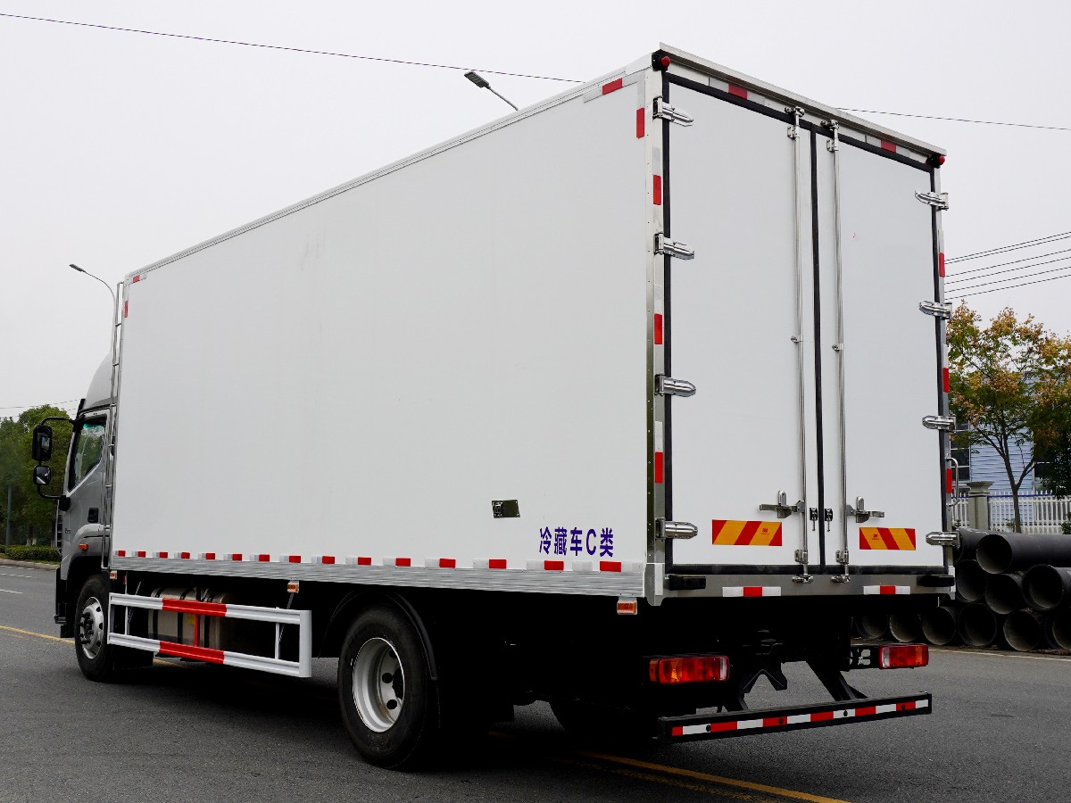 (2)廂板材質(zhì):內(nèi)外壁板選用國內(nèi)優(yōu)質(zhì)玻璃鋼(不吸光、隔熱性好、硬度強(qiáng)、抗氧化);中間保溫層為XPS擠塑聚笨板;廂體厚度8CM。地板采用鋁花紋板,門邊條采用迷宮式橡膠密封條。