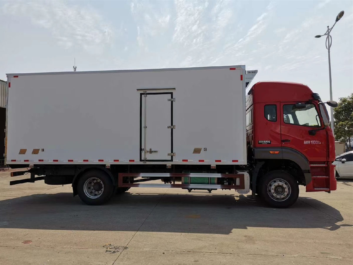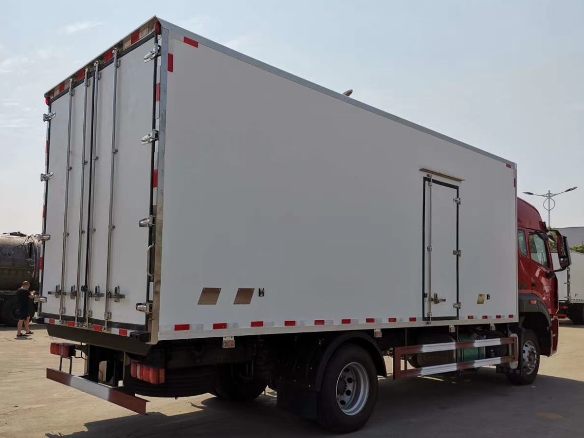 (2)廂板材質:內外壁板選用國內優質玻璃鋼(不吸光、隔熱性好、硬度強、抗氧化);中間保溫層為XPS擠塑聚笨板;廂體厚度8CM。地板采用鋁花紋板,門邊條采用迷宮式橡膠密封條。