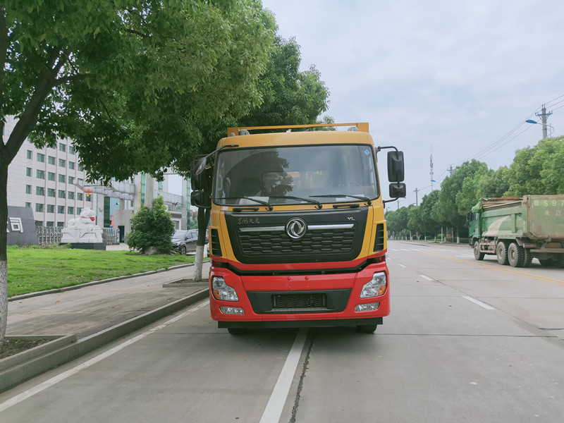 底盤配置: 采用東風天龍底盤,工程黃駕駛室(顏色可選),原廠雙層大梁,法士特9檔變速箱,軸距4350+1350,1100鋼絲胎,原廠abs,帶方向助力,離合助力器,氣剎制動,帶冷暖空調。