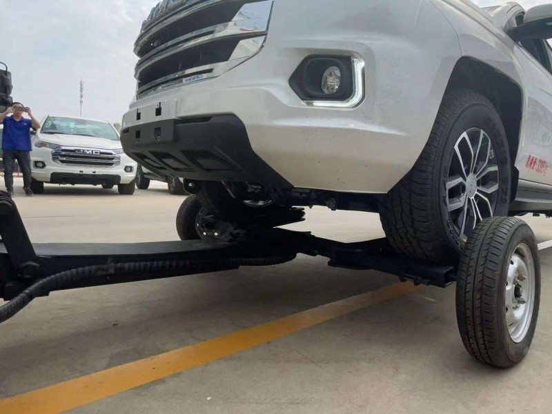 按下托臂降按鈕,將托臂與被拖車輛輪胎接觸,按下托胎收按鈕抱緊輪胎。原車配載輪胎按法規(guī)要求僅允許托舉1噸的車輛,請謹(jǐn)慎作業(yè)。